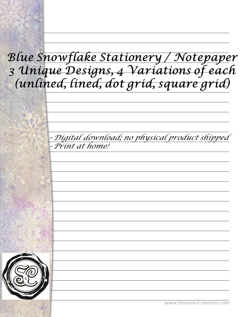 3 designs, 4 variations of each (plain, lined, grid, and dot grid) beautiful soft blue Snowflake Stationery/Notepaper!